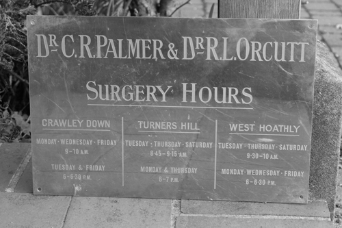 In the early sixties, Doctors Palmer and Orcutt set up a practice, renting the Rosery, a detached house in Hophurst Lane. The Police House was a few doors along. Marguerite Riley lived in the house with her husband Barry and baby son Jason. She started by generally looking after the place for the doctors but eventually became receptionist, secretary and dispenser, sometimes balancing Jason on her hip as she worked.